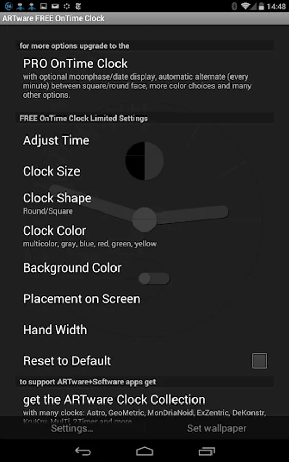 The Free OnTime Clock Live Wallpaper (LWP) is a very small program that runs well on Android 2.1+ devices with Live Wallpaper. This and all other ARTware apps run well on Google's Nexus tablets and the Nexus 4 and Nexus phones.
