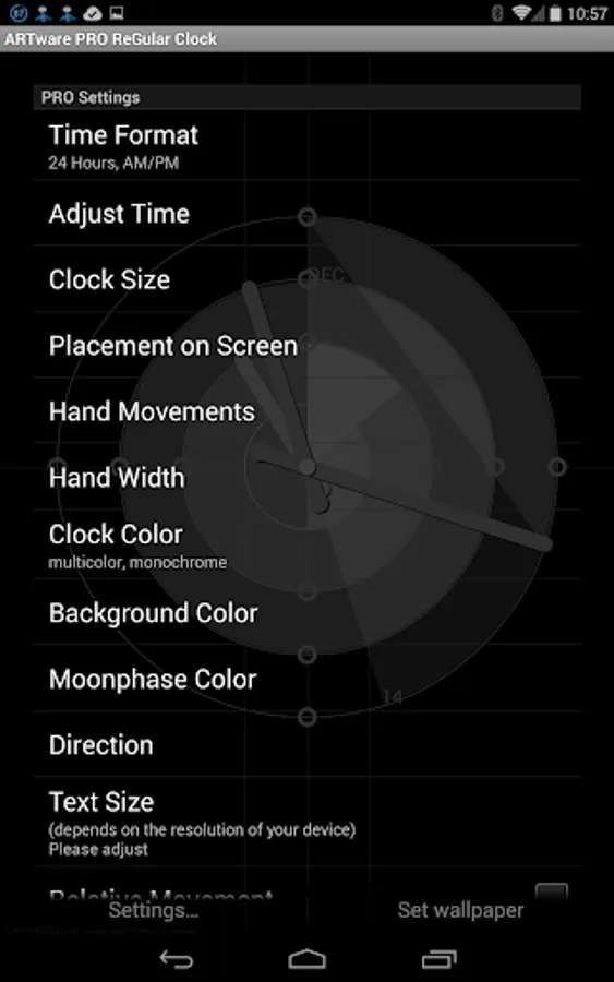 The PRO ReGular Clock is very simple clocks (at least compared with many other ARTware clocks). This clock displays the time and date (year, month, day) and shows the current moon-phase. The PRO Version has many settings options: Widget like Screen Placement, Text Size (or no text), Clock Size, Background Color, Clock Color for new monochrome versions, Moon-phase Color, Date/No Date and Shadows.
