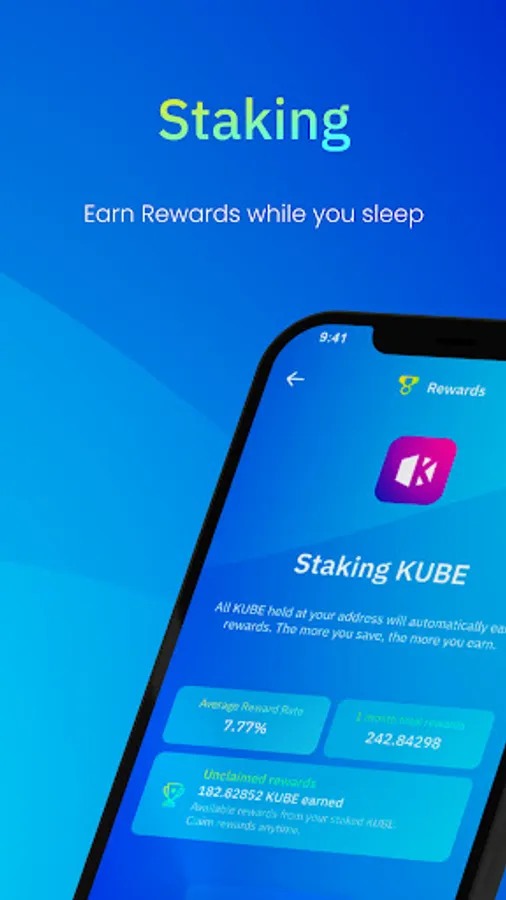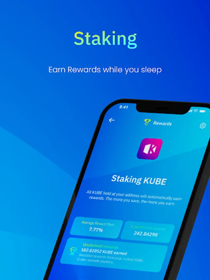 Start earning rewards on your digital assets in KUBE and ADA with our staking protocol. HODL, stake and earn up to 7.77% APY, all without having to lock up your tokens.