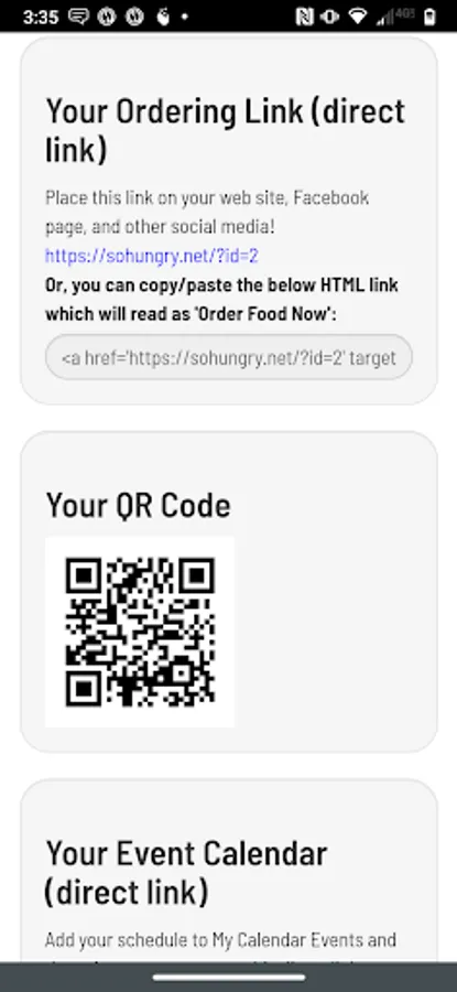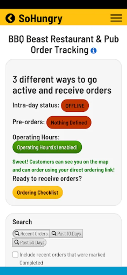 SoHungry.net is a free online ordering app built for restaurants and caterers. Set your hours of operation. Define your menu. Comes with QR codes for table-top ordering. Save money on wait-staff when you can't find enough help. Place your direct ordering link on your website or social media. Customers can self-order when on site or in the comfort of their own home. Configure pickup/delivery. Integrates with 3rd party delivery services and helps you save money. Take customer orders in SoHungry and only pay a fraction of 3rd party delivery services. Or, bring your own drivers. SoHungry puts you in control! Great for any size restaurant or caterer for taking orders directly from customers. Even schedule future pre-orders for pickup/delivery meals for a different date or allow same-day ordering as well! Mark orders completed and even send customer SMS Txt notifications through the app to let them know their order is ready.