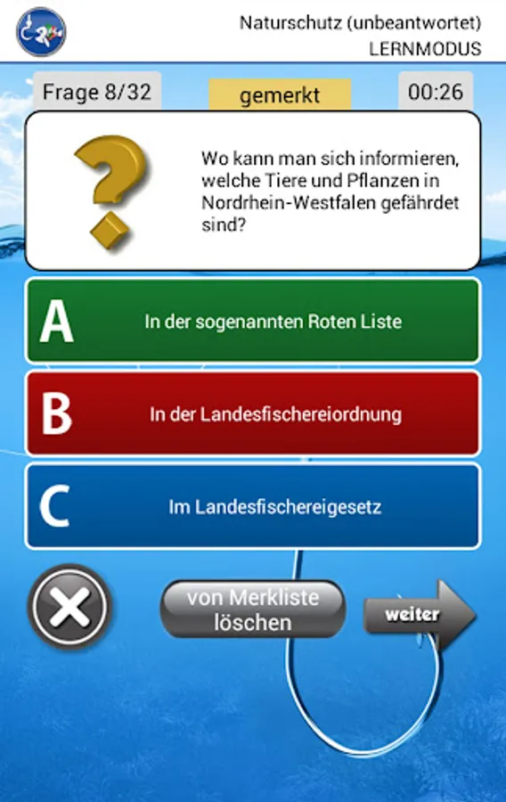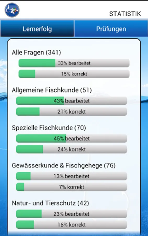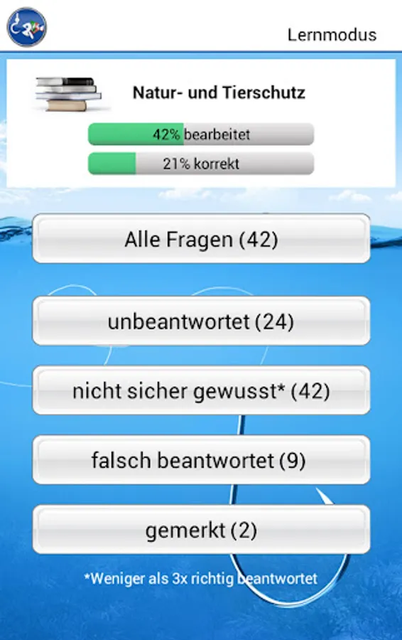 In the learning mode is not only the choice between the different topic areas (General ichthyology, Special ichthyology, hydrology and fishery conservation, nature and wildlife, customer equipment and customer laws). Another selection level offers the possibility to practice targeted unanswered, questions answered incorrectly or pinned. This specific practice leads to optimal and quick results. All questions and answers are sorted randomly!