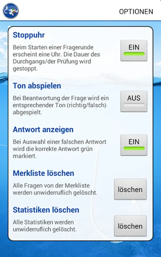 Depending on personal preference, a stopwatch can be displayed during practice or during a test. Upon request, a confirmation tone is played at a correct answer. In order to increase the learning effect will be the highlight of the correct answer disabled incorrect answer a question.