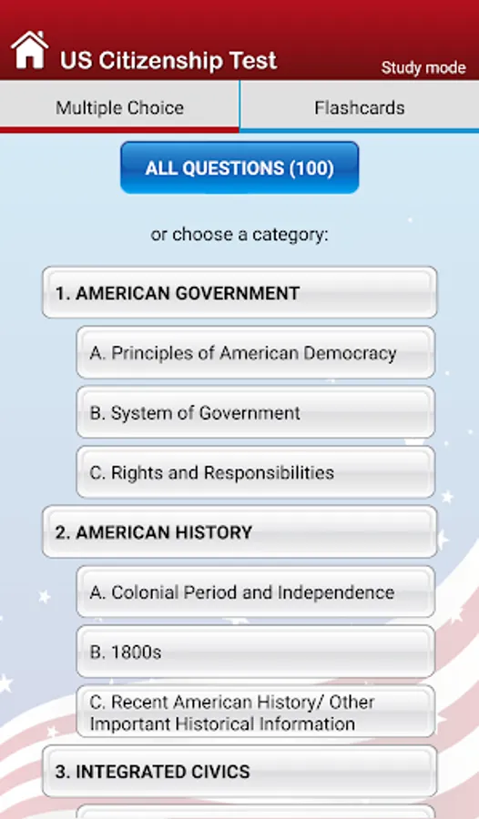 The questions cover knowledge of the American Government (Principles of American Democracy, Systems of Government, Rights and Responsibilities), American History (Colonial Period and Independence, 1800s, Recent American History and Other Important Historical Information) and about Integrated Civics (Geography, Symbols, Holidays).