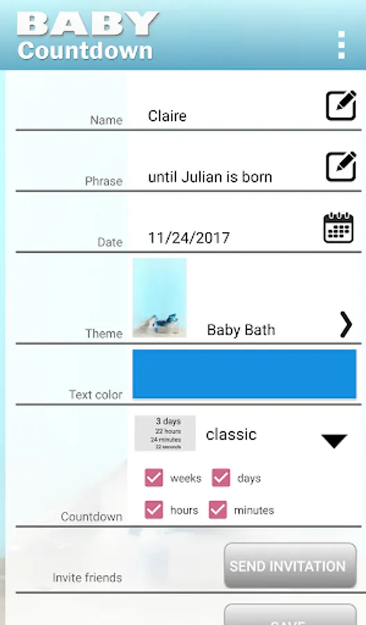 Just set the expected delivery date and the name of your baby and see how long it takes until your baby will be born :)