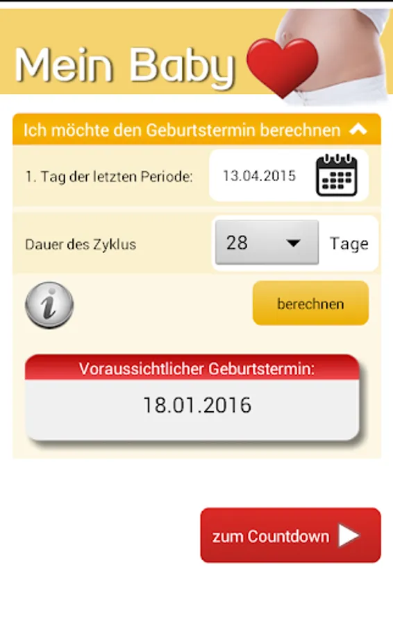 This practical "My Baby - I'm Pregnant" app is the ideal companion through pregnancy. The expected date of birth can either be entered directly or calculated by specifying the time and duration of the last period.