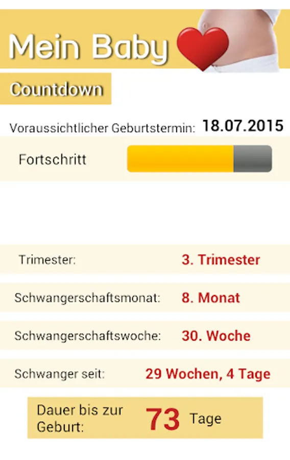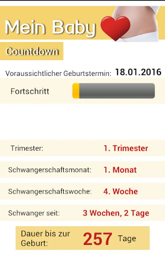 The baby countdown shows the progress in a bar chart, the current trimester, the current month of pregnancy and the current week of pregnancy. You can also see how long you have been pregnant (weeks and days) and how many days pass before you are born.
