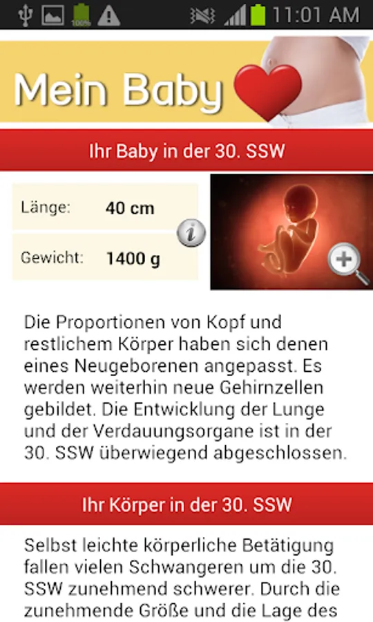As a special extra, the menu item "Development" provides interesting information about height, weight and important developments in every week of pregnancy.