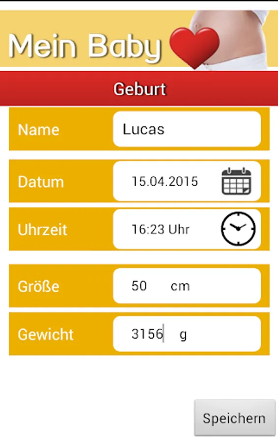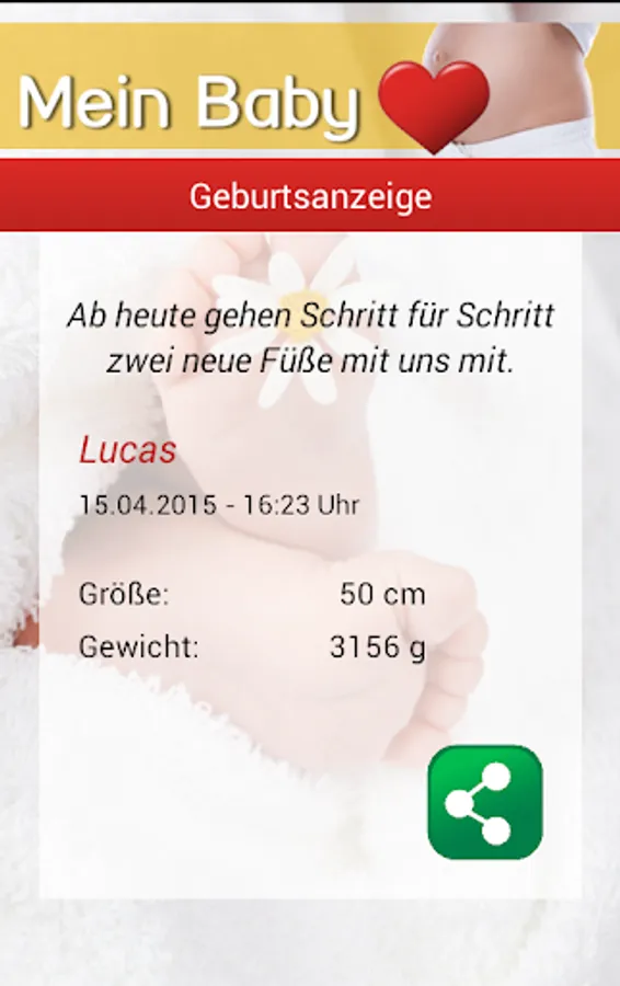 When the wait is over and your offspring finally sees the light of day, you can click on the "Birth" button to enter the name, date of birth, the exact time of birth and the height and weight of your baby. The app generates a birth announcement that can be sent to family and friends via email.