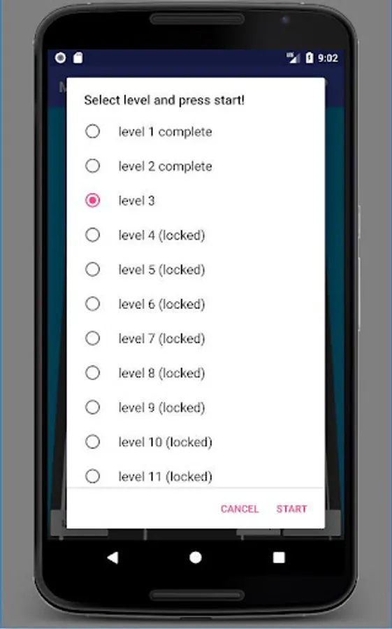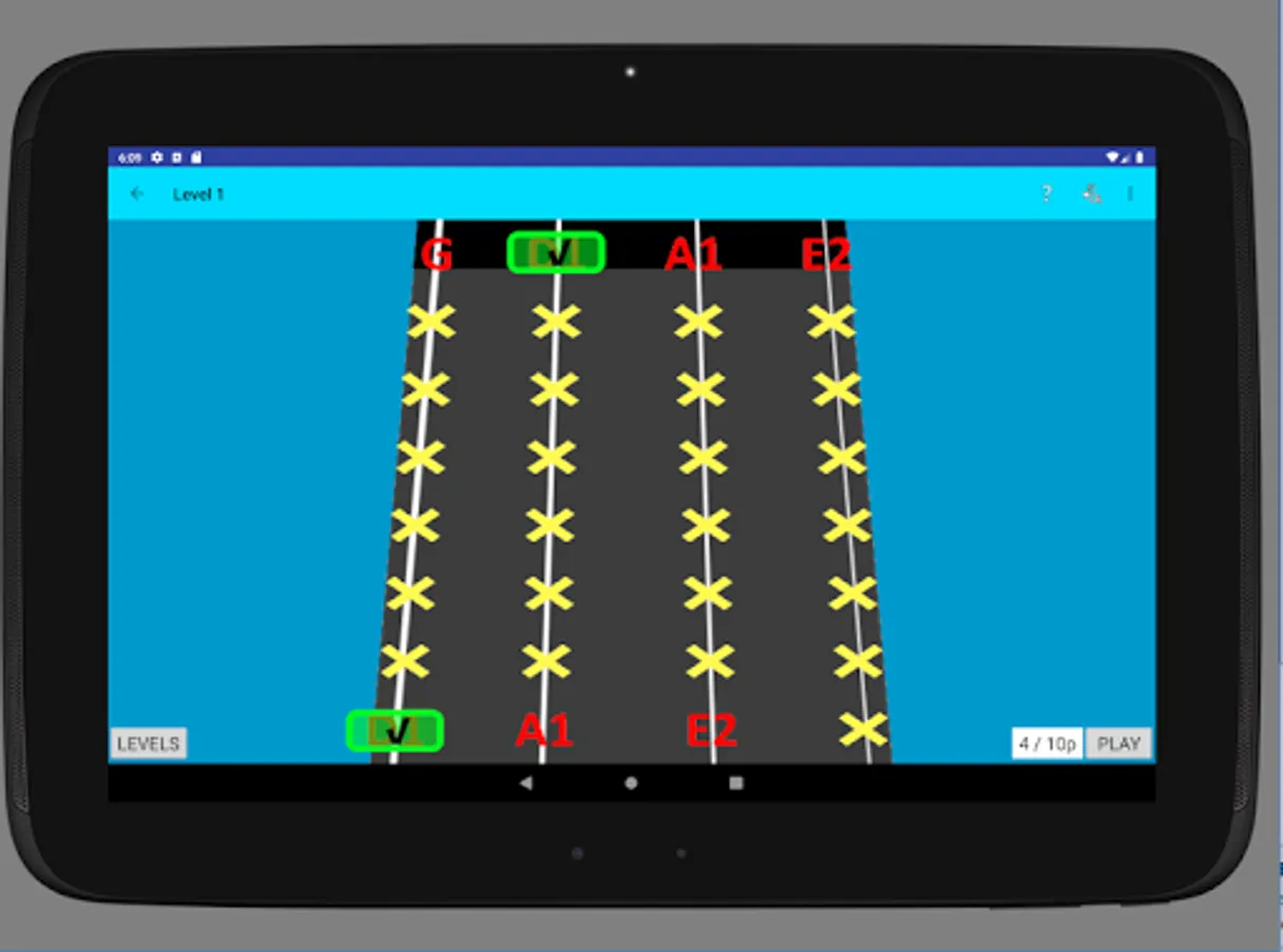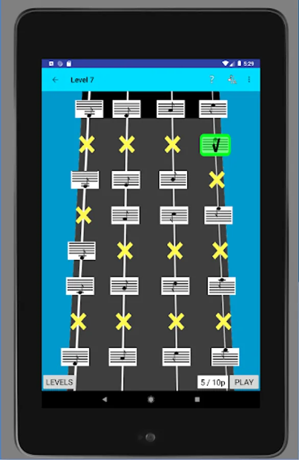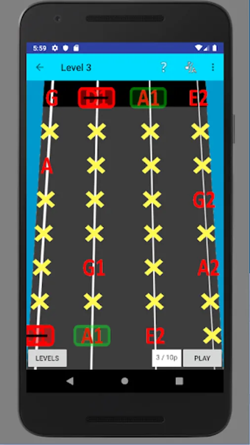 In mode "Play Game" you can test and improve your skill in determining the musical pitch. Press the play button and a tone will sound. Then press and hold down the corresponding note on the violin fingerboard. Compare the two sounds! When the note is released a message displays the result. The game has 12 levels. You have to complete a level to get to the next level.