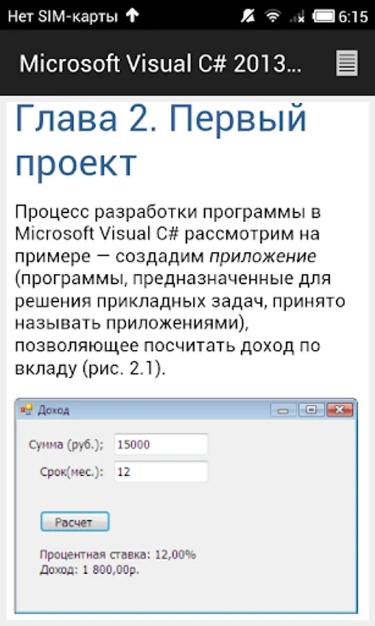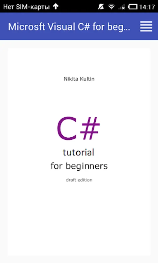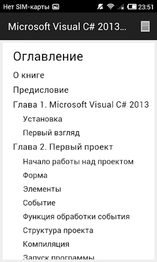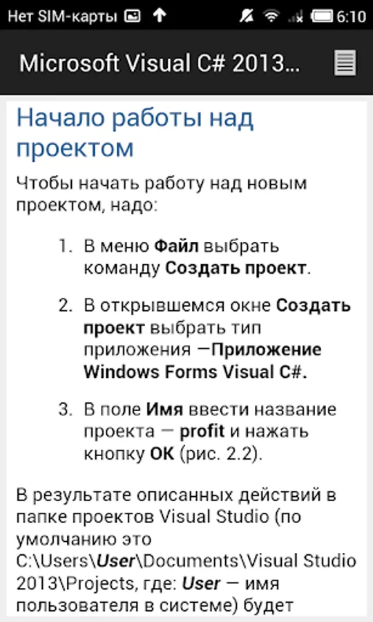 The book is devoted to the practice of programming in Microsoft Visual C # 2013 - the development of Windows Forms applications. In it, to the extent necessary for a novice programmer, a description of the development environment is given, a specific example shows the process of developing, debugging and deploying a program. The purpose of the book is to acquaint the reader with the Microsoft Visual C # 2013 development environment, using a simple example to show the process of creating a program.