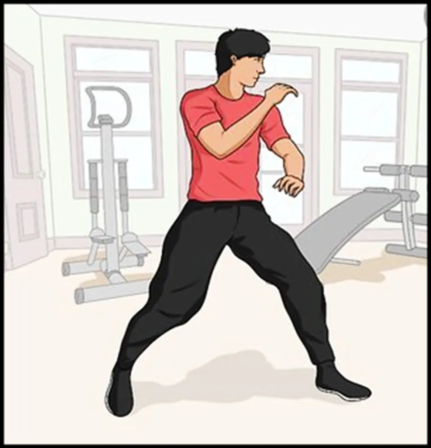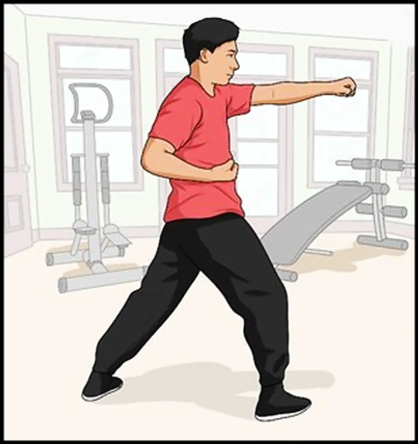 Get into a basic fighting stance and turn your body at a 45-degree angle, with your left foot and shoulder forward.