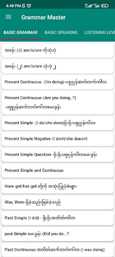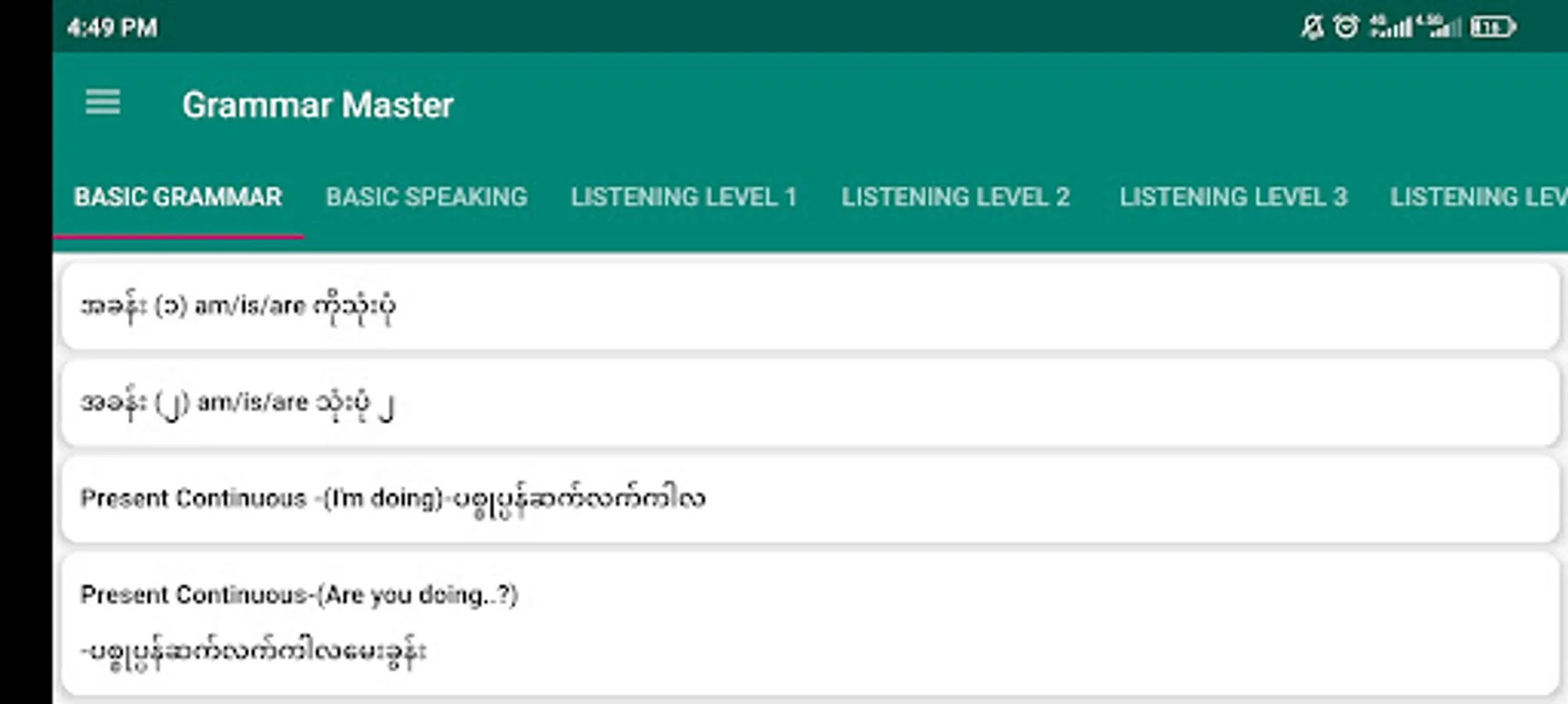 Cambridge Essential Grammar in Use ကိုဘာစာပြန်ဆိုထားတာဖြစ်ပါတယ်..UI ရှင်းလင်းပြီးသုံးရလွယ်ကူတဲ့ app တစ်ခုဖြစ်အောင် စီစဉ်ထားပါတယ်..