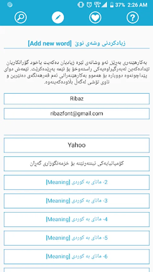 * خۆت دەتوانی وشەی بۆ زیادبکەی. هەروەها دەتوانی مانای وشەکان زیاد و کەم و گۆرانکاریان تێدا بکەیت و لەبەرگیراوەیەکیشی بۆ ئێمە دێت.
