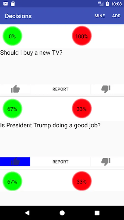 Ever have a Decision you just were not sure of? Something huge? Something Small? Issue your decisions to DecisionsDecisions and let the entire user community help. All they have to do is a thumbs up or a thumbs down. A running tally of the percentage is at the top of your decision. You can click mine to see your decisions or look at the main screen to see everyones. You add decisions by touching add.