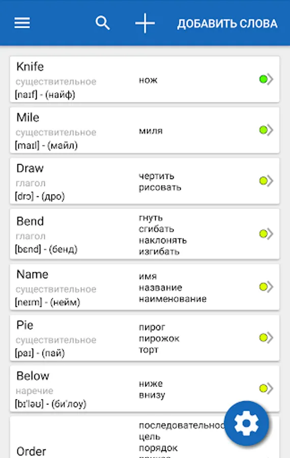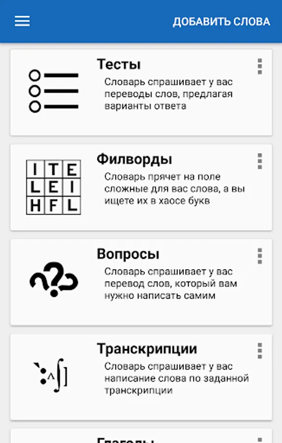 Application to the study of English words. You add words to the dictionary, and the application asks you to translate them. The more you give the right translation of the word - the less you ask him, and vice versa, if you answer wrong - you can be sure, very soon the application again ask you the translation of the word.