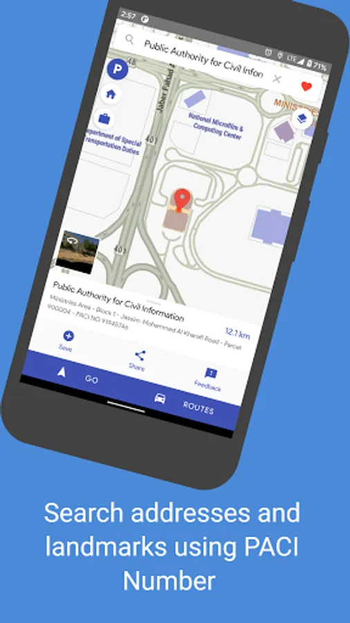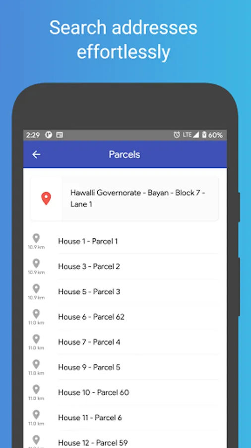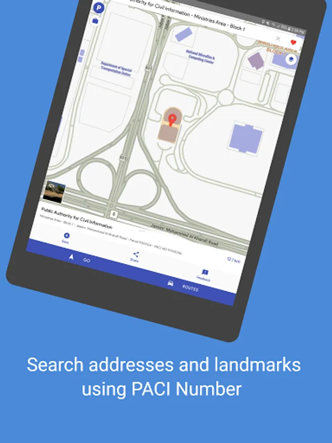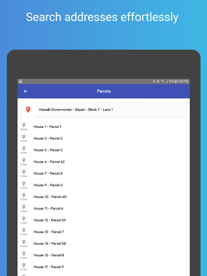 • Search for addresses effortlessly using a quick search via Governorates, Areas, Blocks, Streets and Parcels/Houses