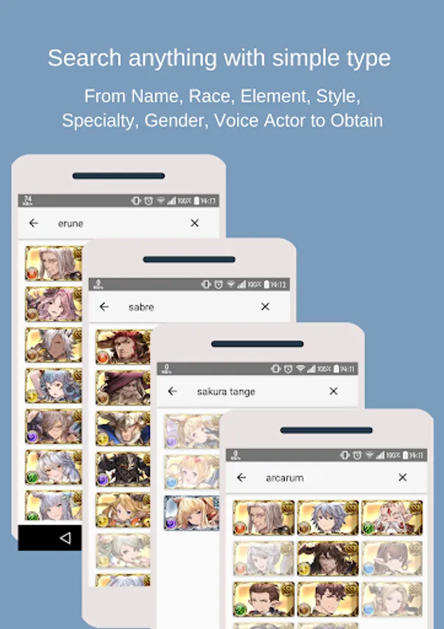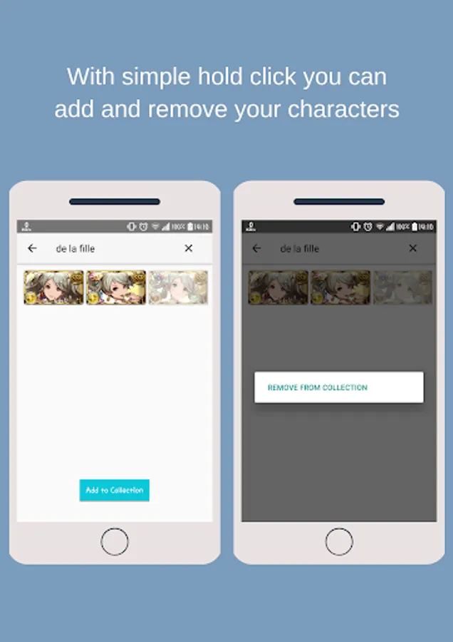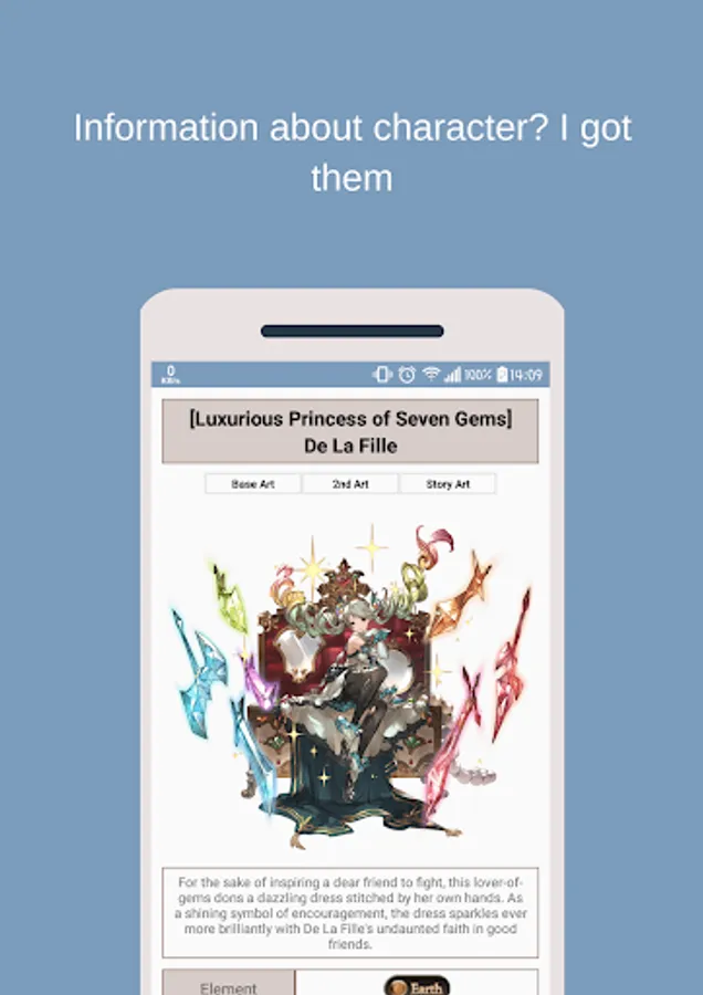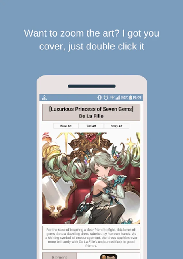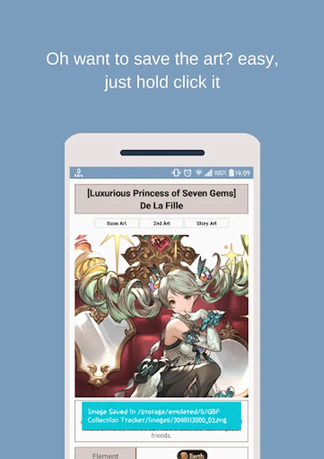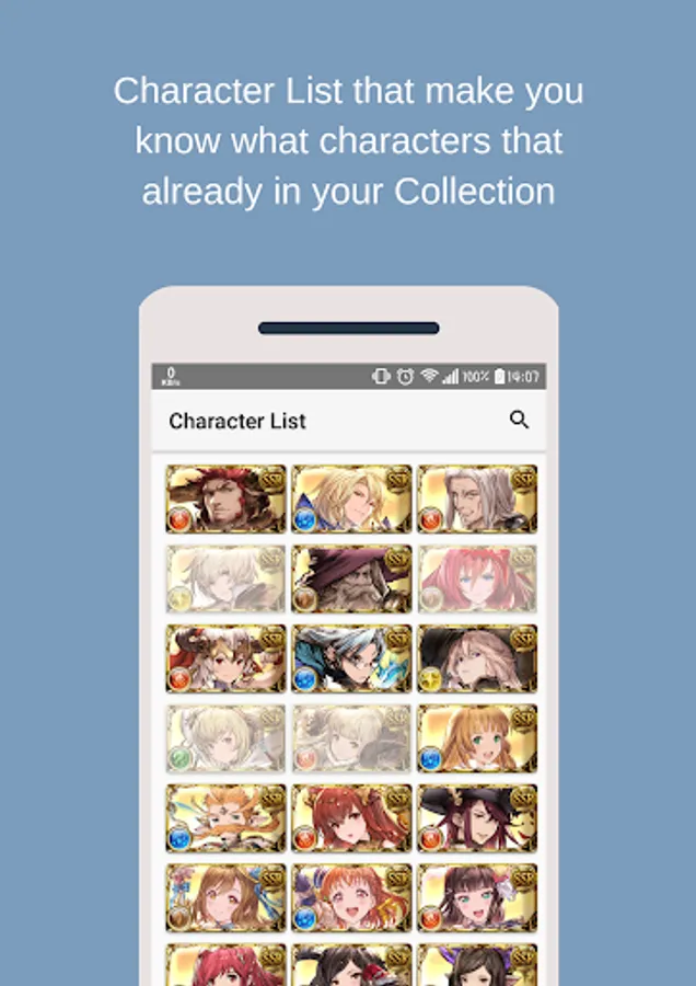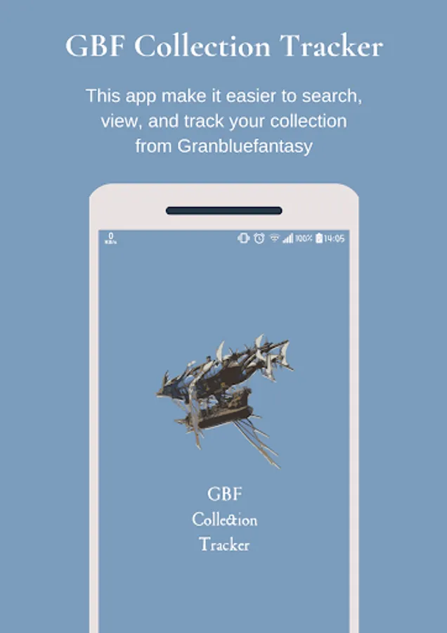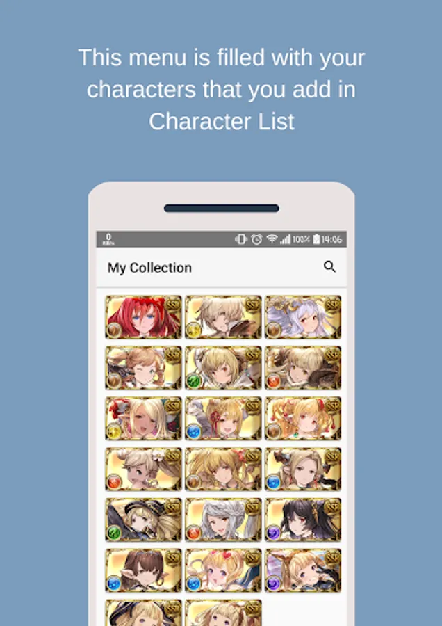 This is app is Android Version from Collection Tracker GBF.WIKI, its provide all characters from game Granblue Fantasy that wiki have, you can save it to My Collection to store your already have characters in game, it have information details about characters except for the skills, you can see all character you don't have yet, search what character you want to add, and also you can zoom and save the arts from your favorite characters.