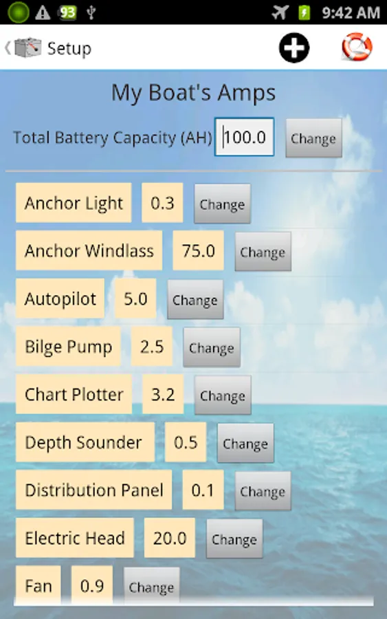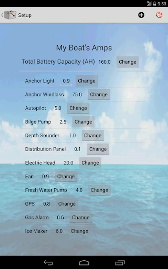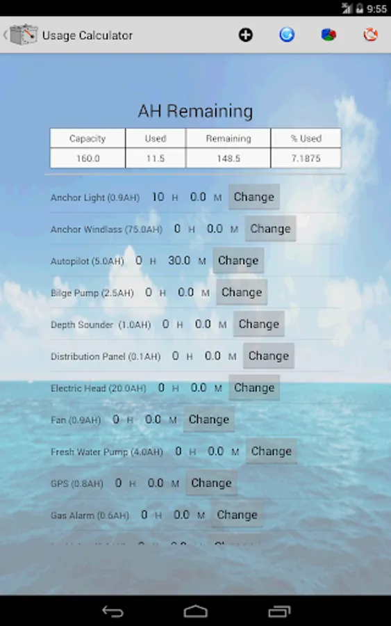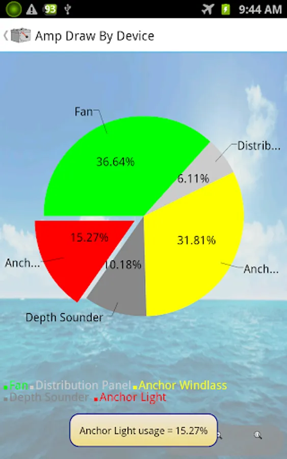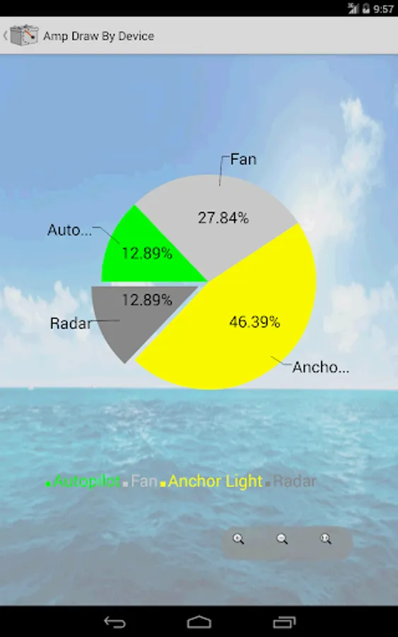 The app can display a simple pie graph, detailing which of your electronics are drawing the most energy. All amperage draws are fully customizable for your device... or you can simply use the stock numbers. You can add, change the name of, or hide any devices that may be specific to your sailboat or power boat.