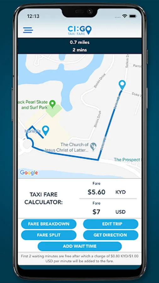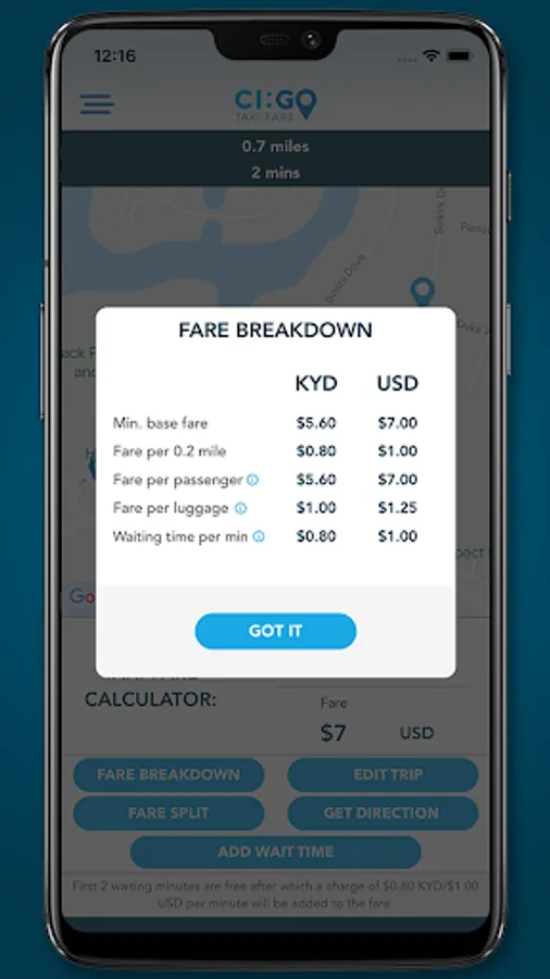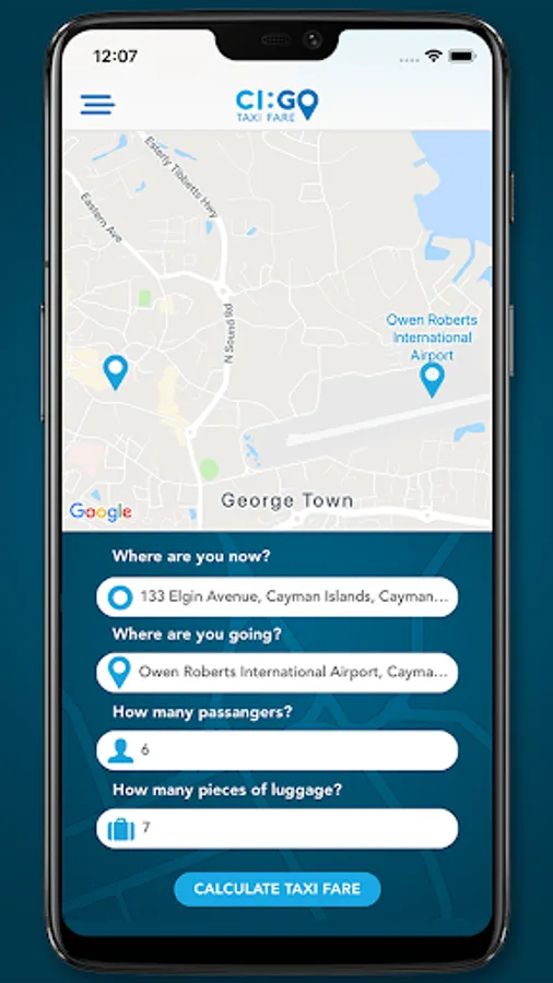 Drop a pin or enter the pickup and drop-off location of your intended ride, then specify the number of passengers and how many pieces of luggage. Based on the information provided, the app will calculate the fare in both KYD and USD dollars.