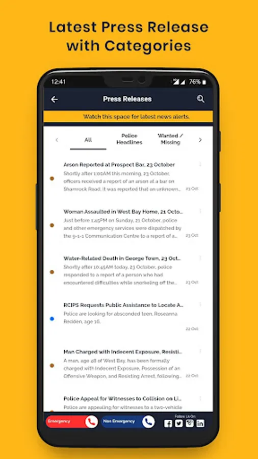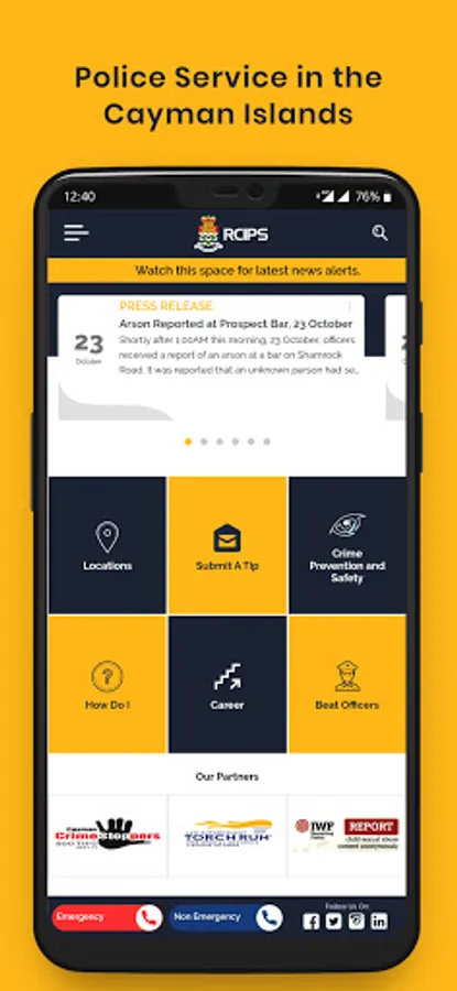 This application is the mobile version of the website of the Royal Cayman Islands Police Service (RCIPS), which is the single, national police service of the Cayman Islands. The RCIPS website, launched in May 2018, has become a critical source of information for those living in the Cayman Islands. This mobile application, available for both Android and iPhone, makes the information on the website easily accessible anywhere. Users will have crime press releases and public safety information, as well as road closure and traffic accident updates, displayed in a readable format on their phones. Notification options further enable residents to be updated with this practical information in real time.
