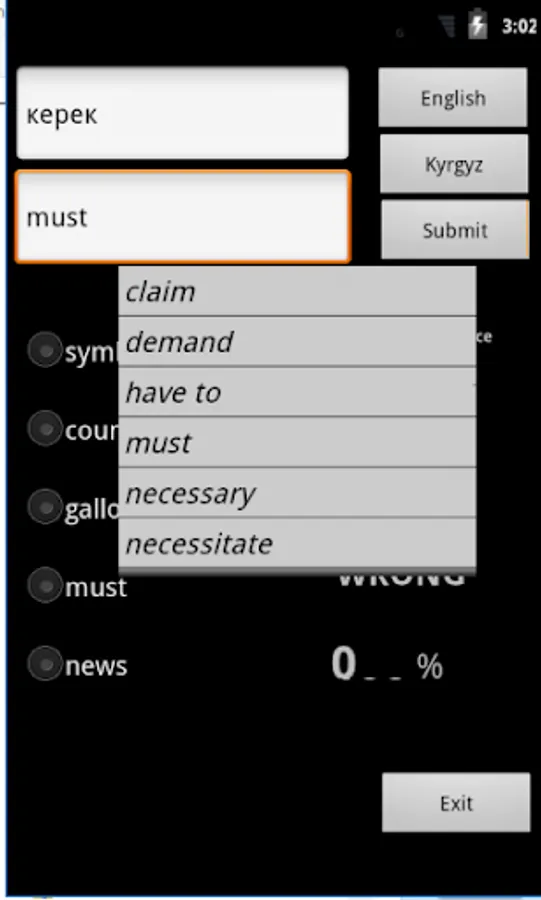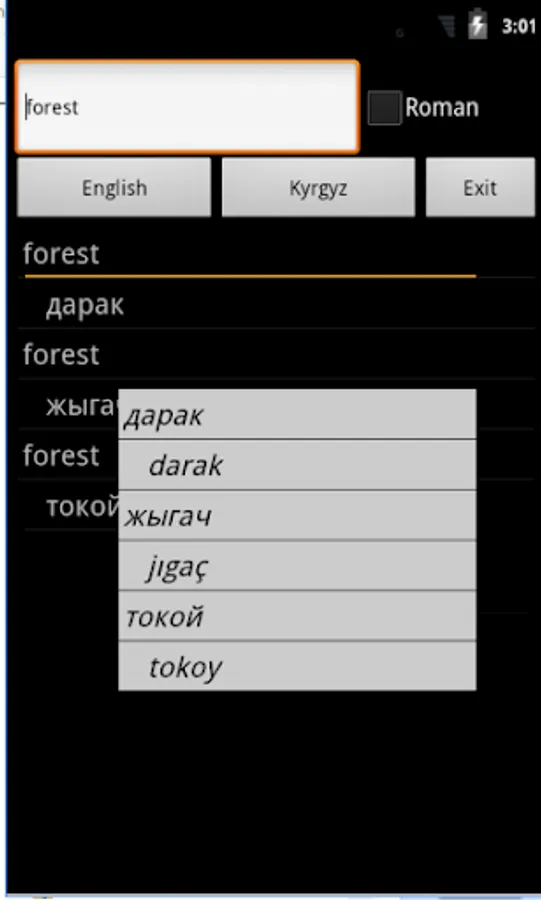 Kyrgyz English Dictionary - travel dictionary to translate Kyrgyz to English.Copying a word from the translated list for a reverse translation can be used to find synonyms and to understand the broader use of the word. Although the dictionary does not provide definitions or examples, the use of the translation software in this way provides you with a mechanism to better understand English words in the Kyrgyz context without the need for definitions.