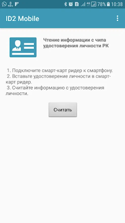 The app allows you to read information from the identity card of the Republic of Kazakhstan as well as to check the integrity of the written data.