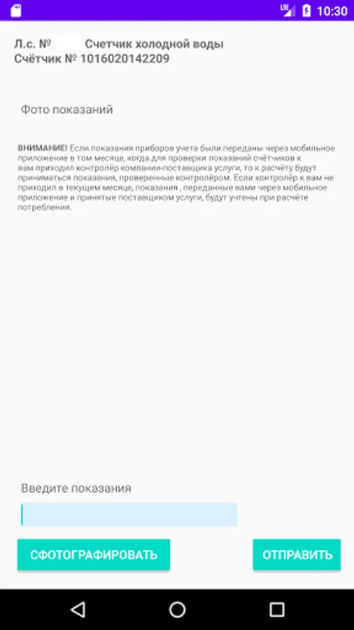 With the help of the application "Personal account of the consumer of the services of the GKP on REM Kokshetau Su Arnasy" you can transfer the readings of your metering devices to the database with a photograph confirming them. This is especially convenient for consumers who are difficult to find at home.