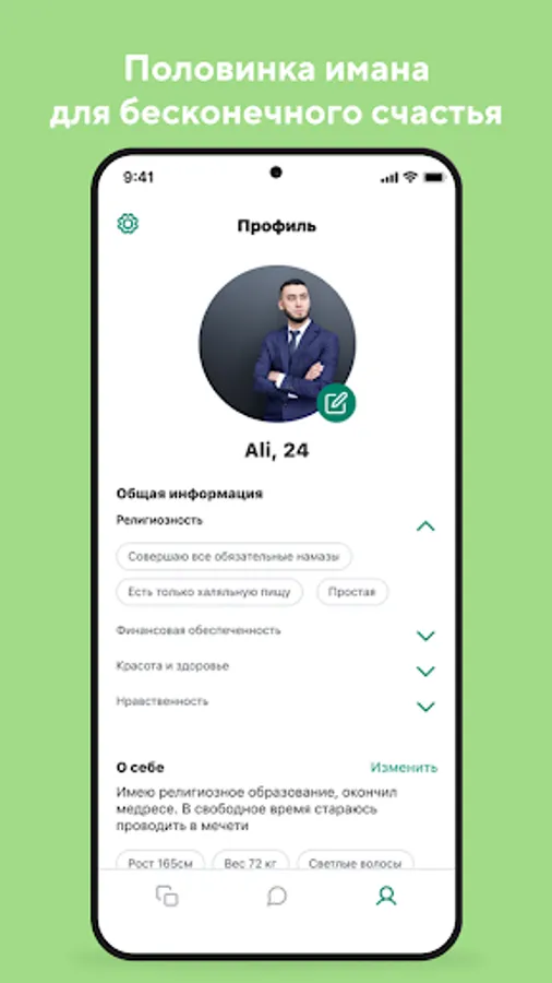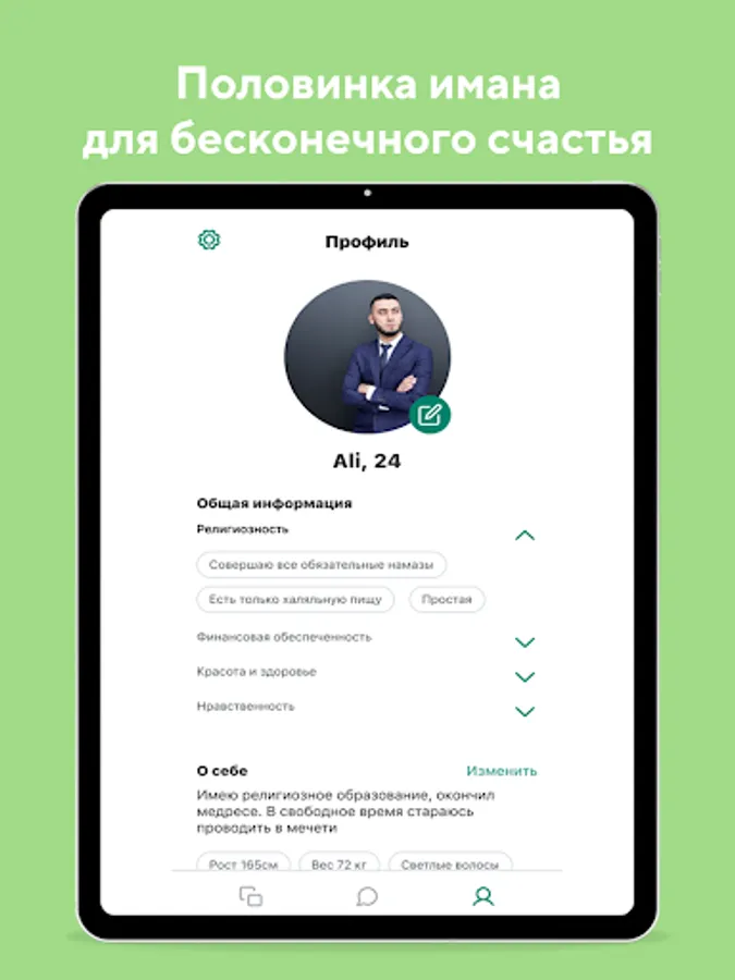 80% мусульман ищут спутника жизни через родственников, знакомых или онлайн. Однако члены семьи многих мусульман не придерживаются религии, а родители не помогают в поисках. Знакомства в популярных социальных сетях и мессенджерах не предоставляют гарантию безопасности. Наша цель – помочь мусульманам справиться с подобными препятствиями и открыть путь к созданию счастливых семей. В Нашем приложении можно знакомиться с проверенными мусульманами безопасно и по нормам шариата.