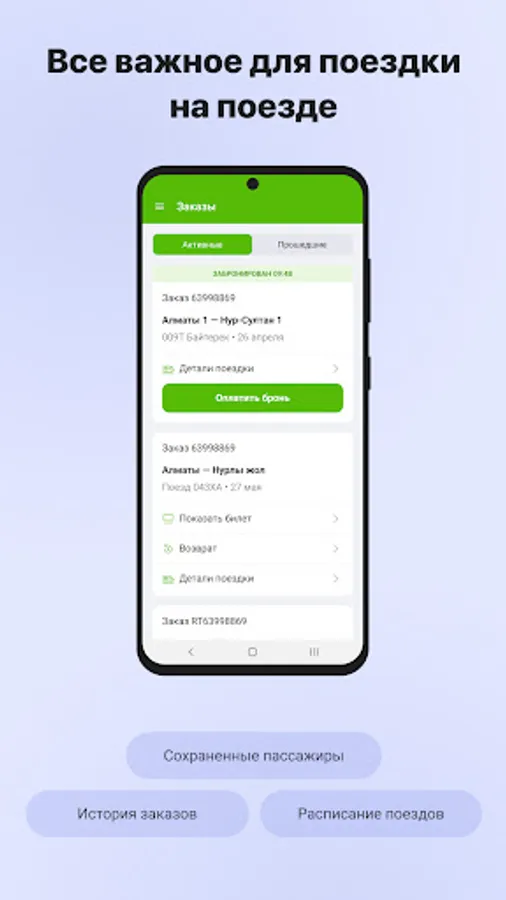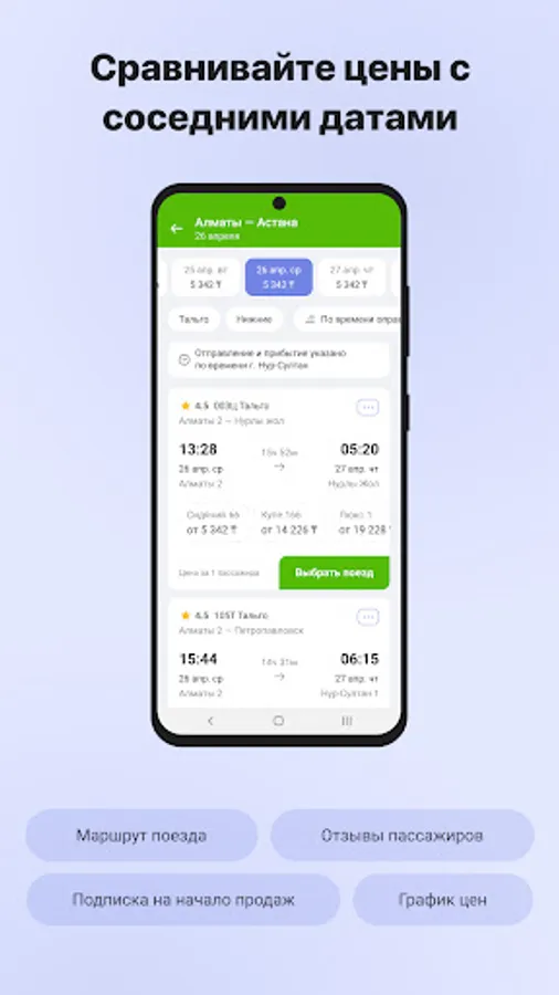 In the Aviata Railways application you can buy tickets for the Almaty - Astana train, tickets for the Shymkent - Astana train, tickets for the Astana - Almaty train and any other railway tickets in Kazakhstan.