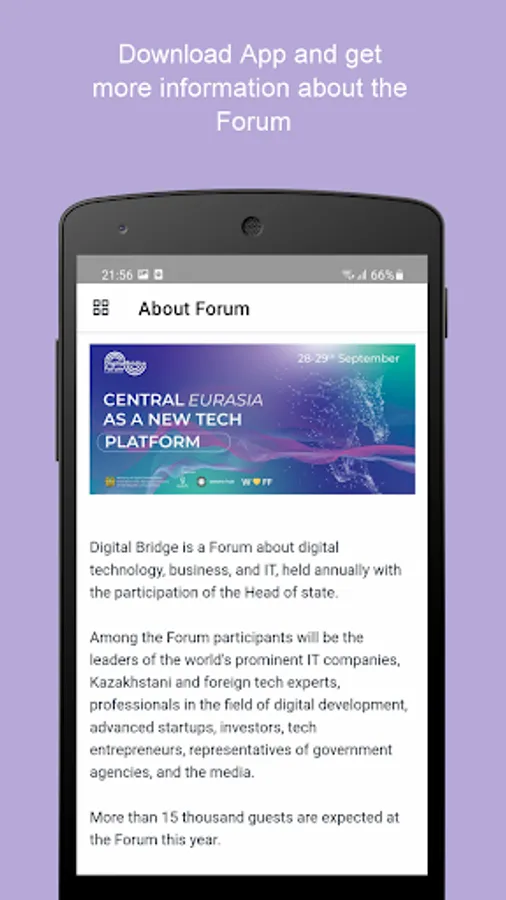 DigitalBridge is a mobile application developed specifically for the international forum on digital technologies, business and IT, which will be held on September 28 and 29, 2022 at the Expo IEC, Nursultan, Republic of Kazakhstan.