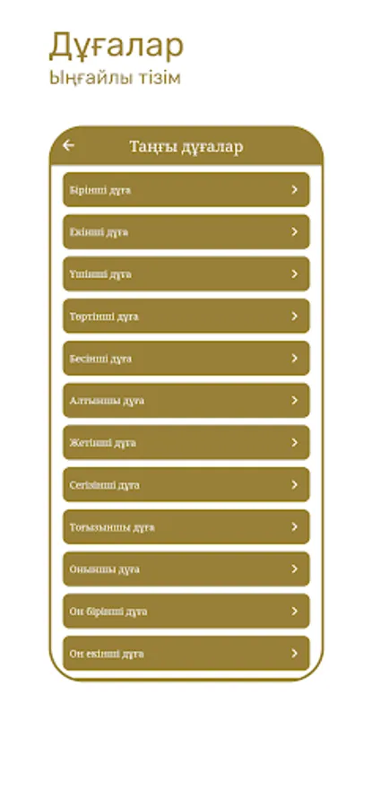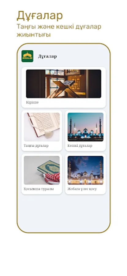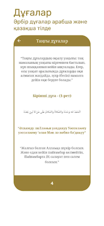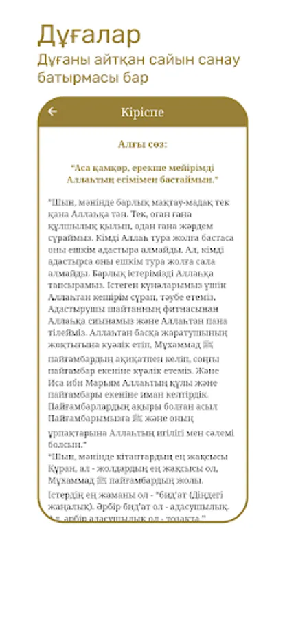The mobile application contains morning and evening prayers. In addition, there is a special counting button that counts the number of prayers. The texts are written with Arabic and Kazakh translations.
