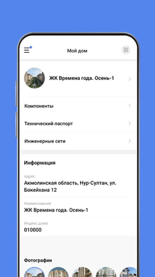 The "My House" menu allows you to see the components (such as entrances, elevators, windows, etc.), technical passport and engineering networks of a residential building.