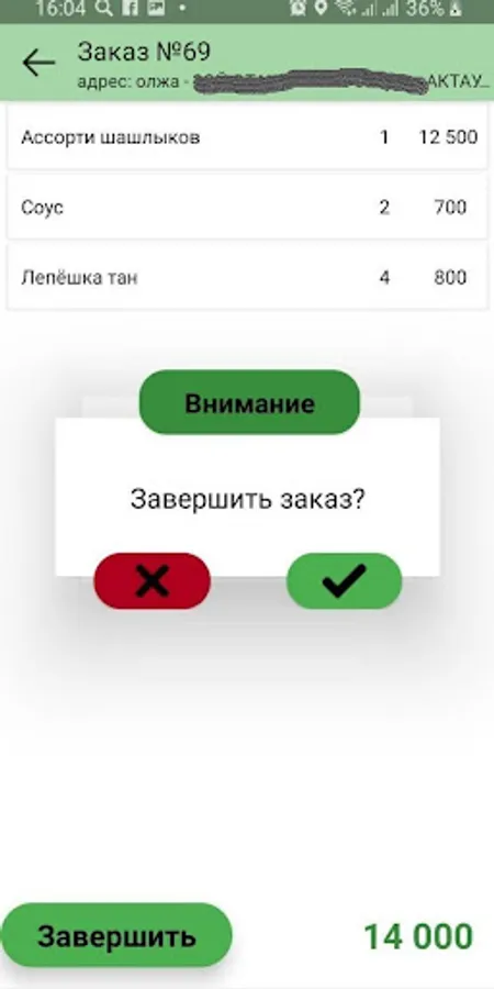 . The application displays the delivery address, amount, time of the planned delivery, as well as the contents of the order.