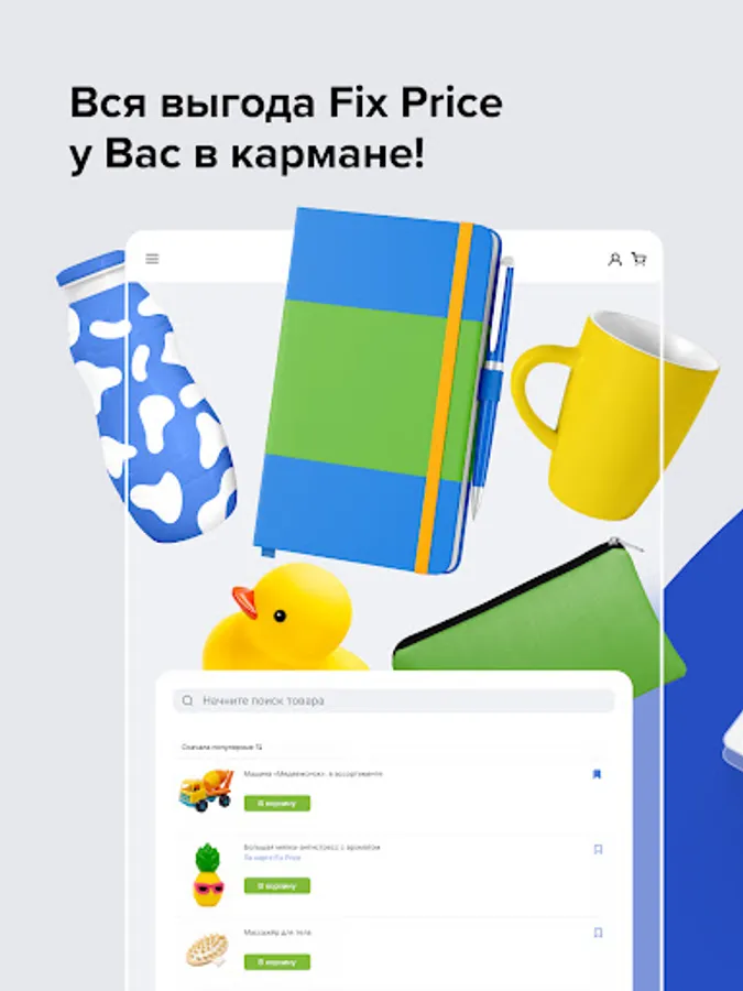 Choose from more than 2000 products, place an order, wherever you are, receive and pay for purchases in a convenient way for you! Fit shopping into your schedule by choosing when and where to pick up orders. Make purchases in Fix Price according to your own rules!