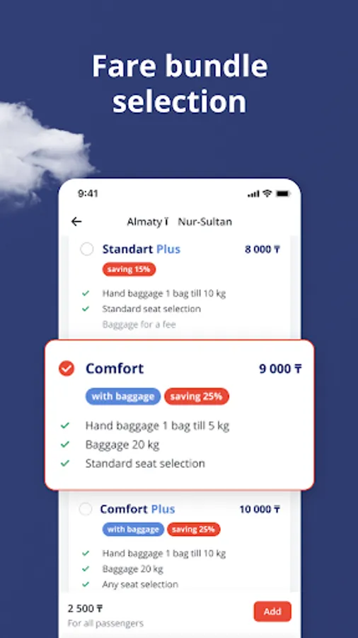 When starting the application, you select the place of departure and arrival, and indicate the required dates and the number of passengers. The system generates, based on requests, available aircraft and current prices for the flight. Next, you need to select the fare: Standard, Standard Plus, Comfort, Comfort Plus, depending on the amount of baggage carried. After filling in all the required fields, you have boarding passes for flights. The next step is to fill in information about yourself.