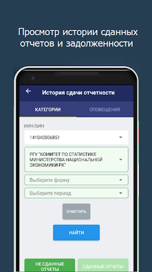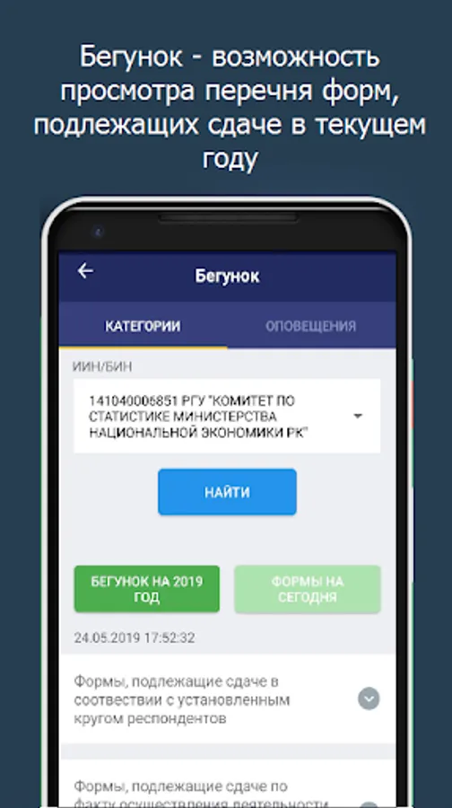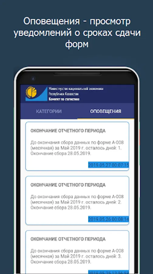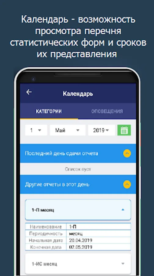 The application allows you to view information about the statistical forms required for submission to the statistical bodies, view the history of delivery of statistical reports, check the debt, provides an opportunity to receive personal notifications about the occurrence and the deadlines for submission of reports.
