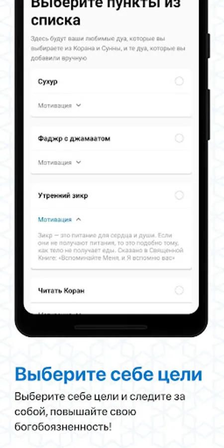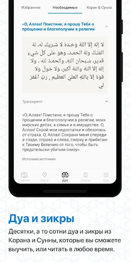 Dozens or even hundreds of duas and dhikras from the Koran and Sunnah that you can learn or read at any time.