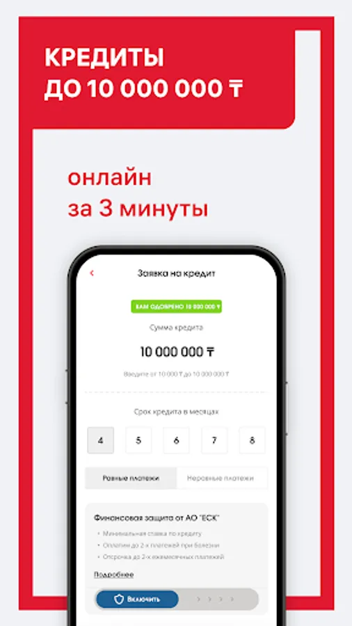 The minimum loan amount is 10,000 tenge, and the maximum is 10,000,000 tenge. The loan term ranges from 6 to 60 months. You can apply for a loan from the comfort of your home.