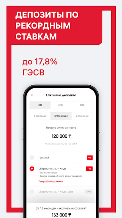Open a profitable deposit with daily capitalization online. Top up your deposit with any Kazakhstan cards. Track your daily rewards and receive detailed statements. The entire process takes place within the application and there is no need to visit the bank's offices.