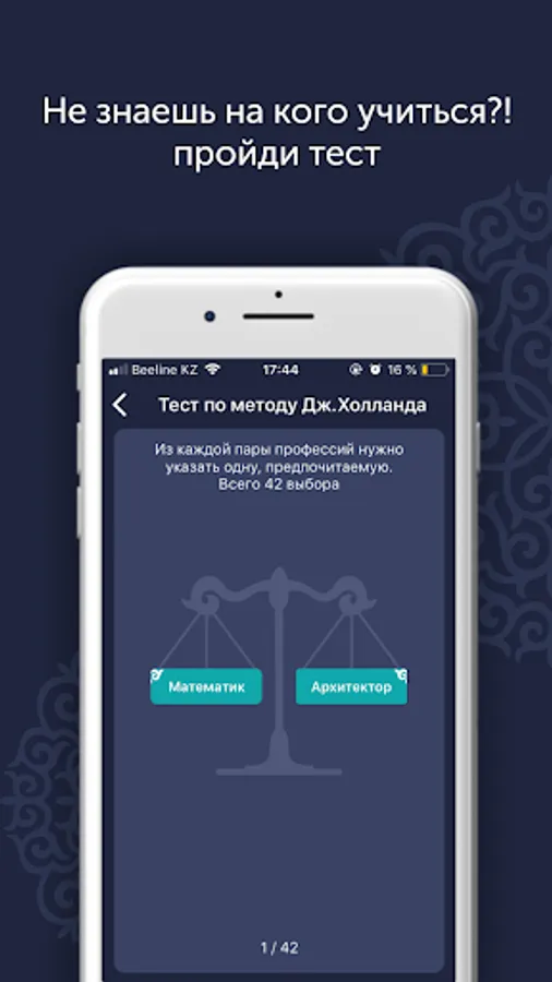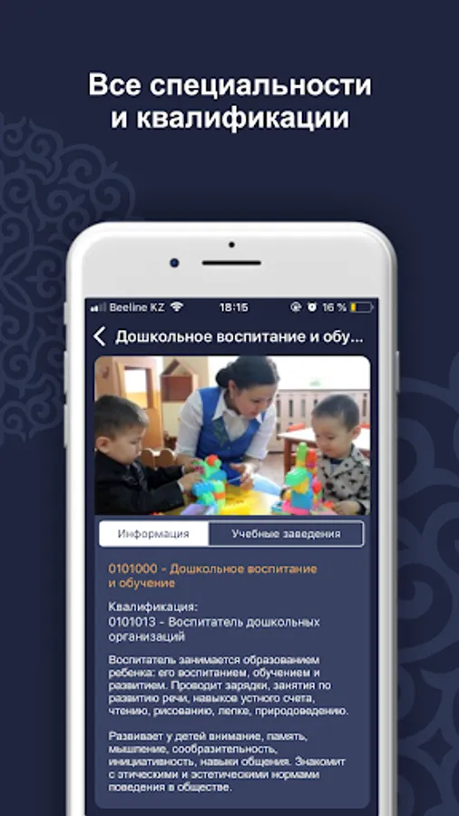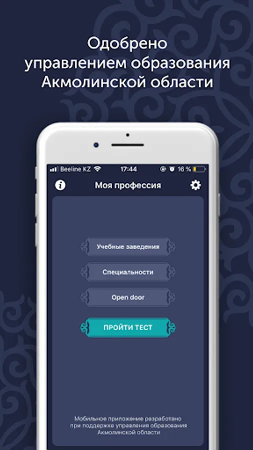 Mobile application "My profession Aqmola" was developed in order to improve the quality of career guidance in the Akmola region, which will help high school students navigate the diverse world of modern professions, based on the identification of inclinations and interests according to the results of the test of the famous psychologist John Holland.