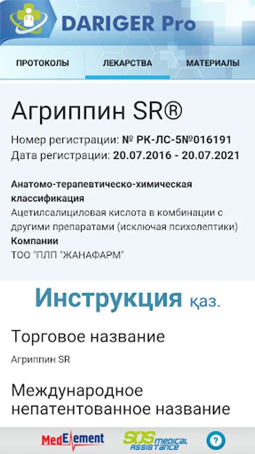 The app additionally includes a section "Medicines". It provides instructions to the drugs registered in the State Register of drugs Kazakhstan, the Kazakh and Russian languages (section during filling).