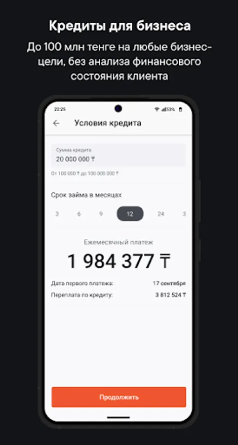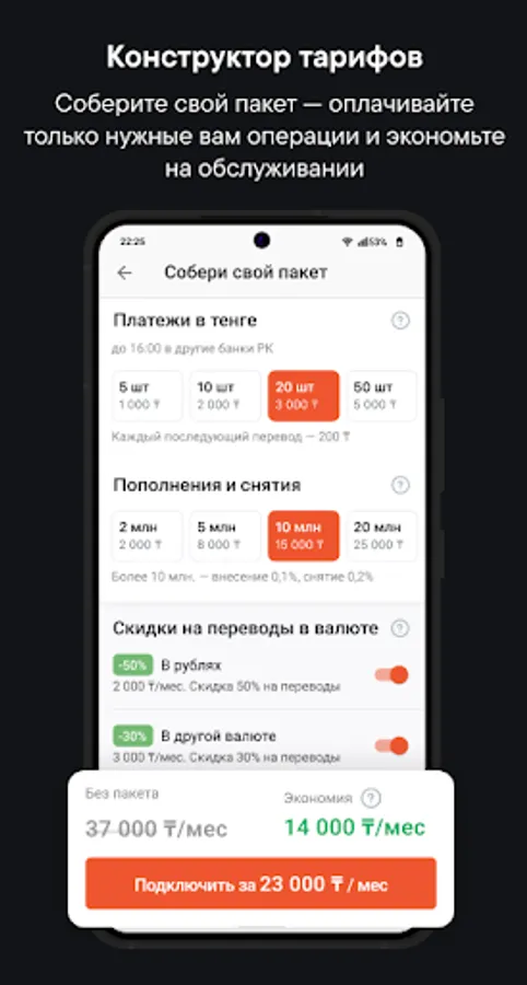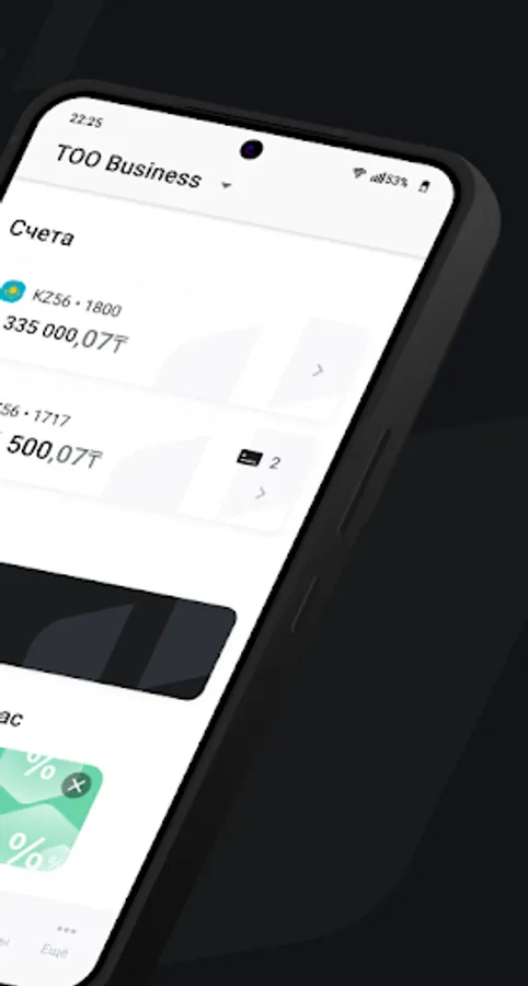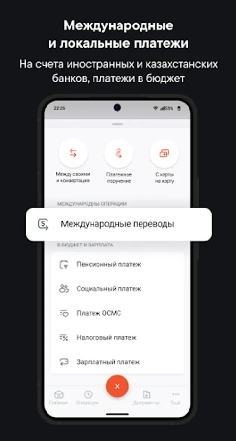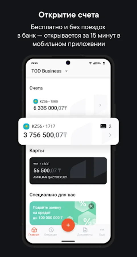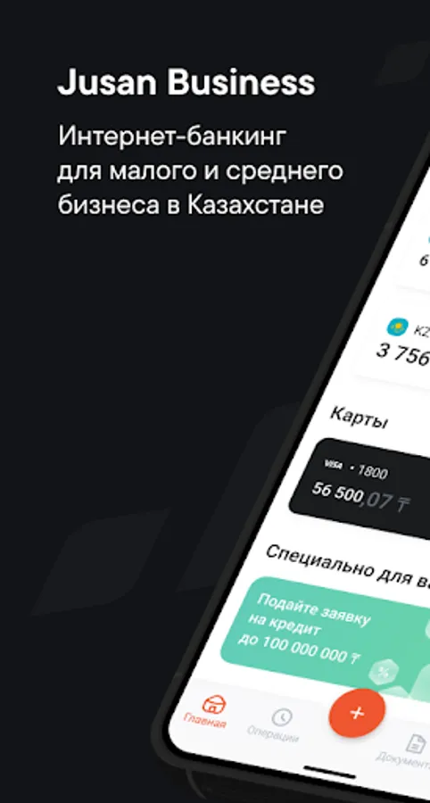 Open online accounts in KZT, USD, EUR, RUB, KGS. Create payments and sign them with an SMS code. Scan invoices and send payments to counterparties. Make P2P transfers. Generate statements and references. Receive push notifications for completed transactions.