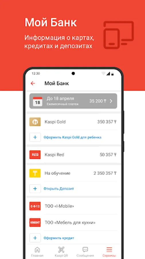 • Оформление Kaspi Gold, Kaspi Red, кредитов и депозитов прямо в приложении
