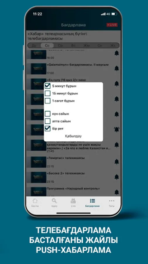 - Telebaғdarlamanyң bastalғany jaili khabarlama. Siz kez kelgen uagytta suyikti shouygyz nemese serialyzdyk bastalatyny zhaily 5 minutes, 15 minutes, 1 saғat kalganda eske salu batyrmasyn kossagyz boldy. Ony kundelikti, apta sayyn nemese bir rettik dep taday alasyz.