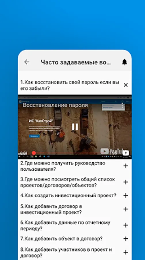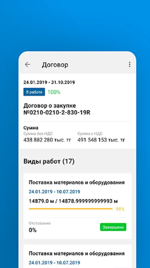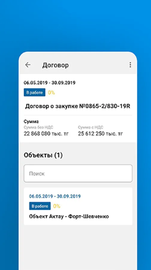 The “Contracts” module of the mobile application is intended for viewing contracts within the framework of an investment project. Within the framework of this module, the System enables all users of this contract to view documents, technical resources, users with the role of Regional contract manager for the following functions: