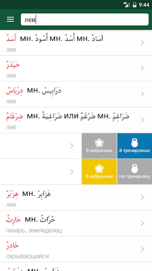 The displayed words can be added to the "Favorites" or "Training". To do this, you need the correct way to hold the right to the left and click on the desired button, depending on where you want to add a word.