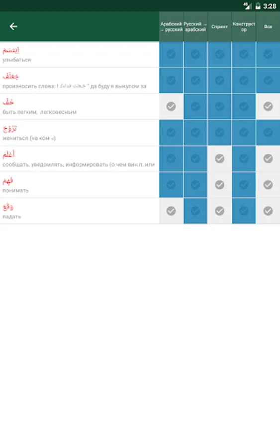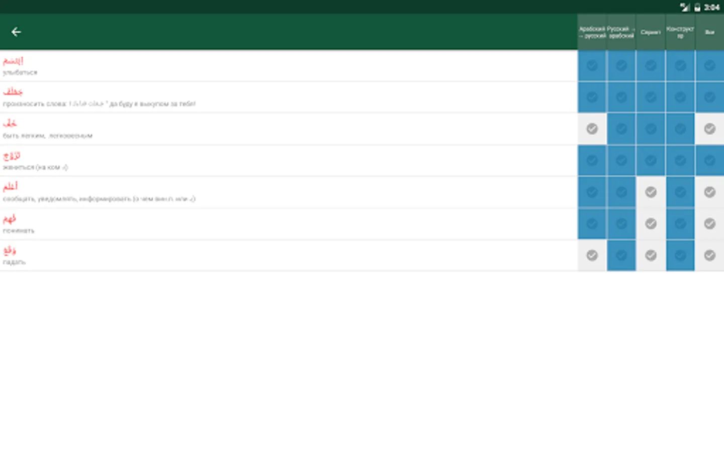 In the application there are 4 types of training: "Arabic → Russian", "Russian → Arabic", "Sprint" and "Designer".