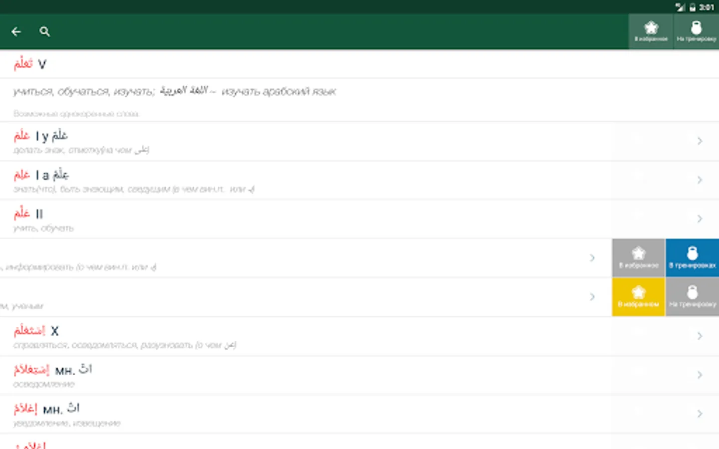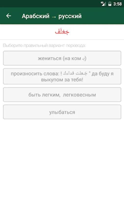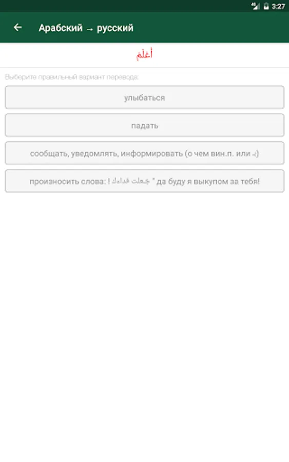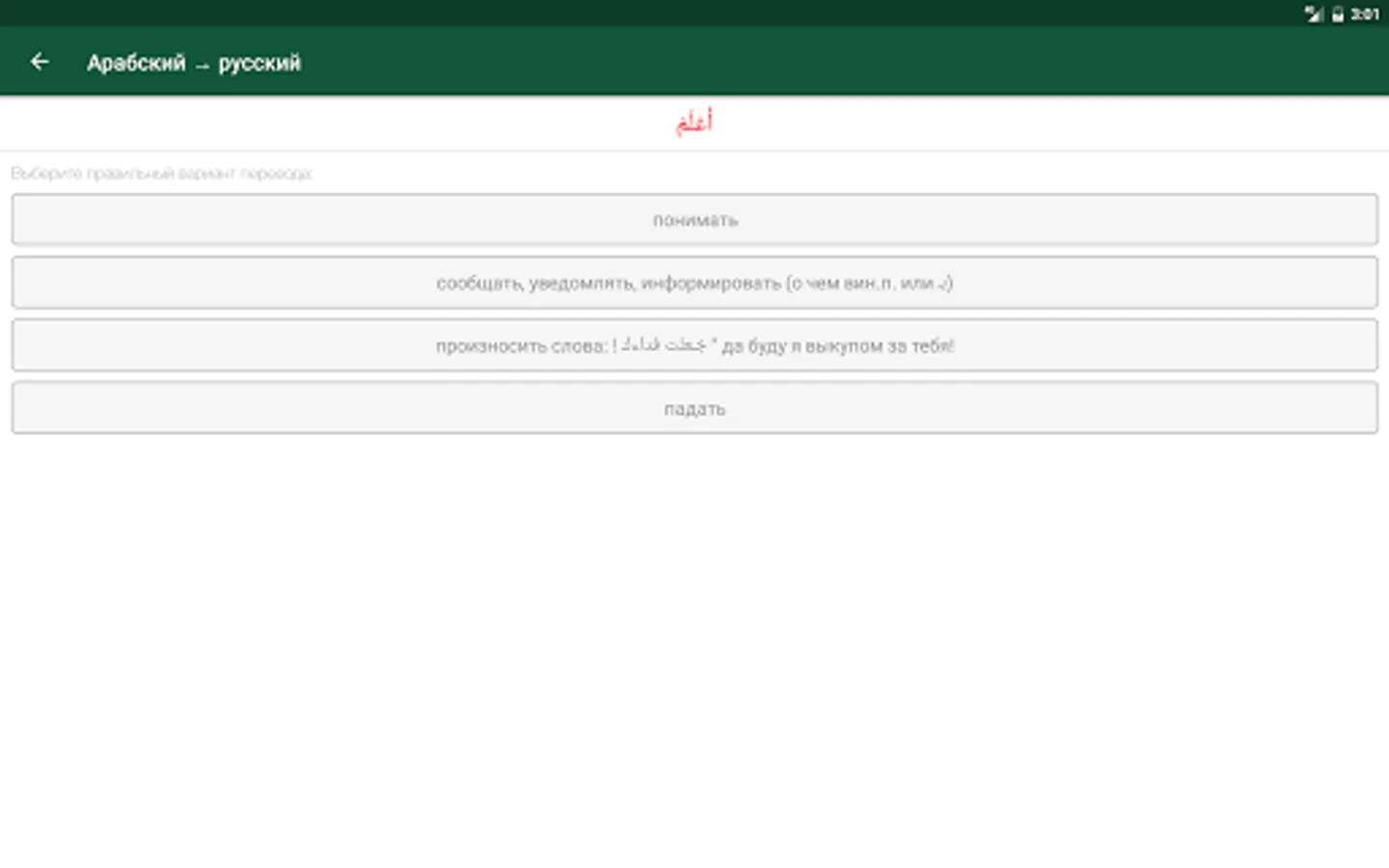 The training "Arabic → Russian" shows you the word in Arabic and 4 variants of translation in Russian. It is necessary to choose the right one. After selecting the app will show you whether you have answered pravlno. In training, "Russian → Arabic ', respectively, on the contrary.