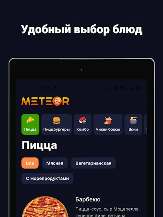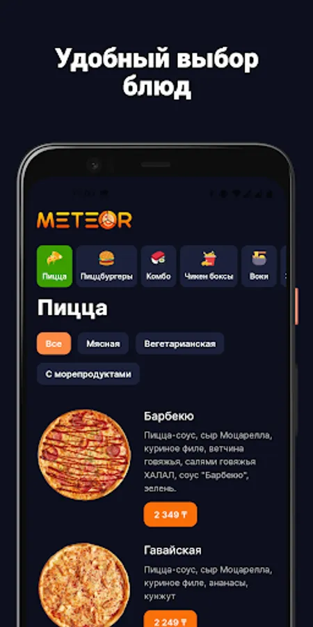 Do you have a special day? Holiday, event or you are in Almaty for the first time and don't know where to order food? There is one universal solution to all these questions - contact METEOR. For your pleasure, you can order pizza, pizza burgers, wok (wok), as well as soups, drinks and much more.