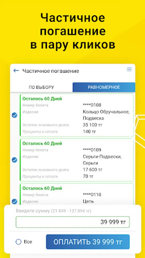 • evenly (specify the planned amount and the application will independently and evenly distribute the payment between pledge tickets).
